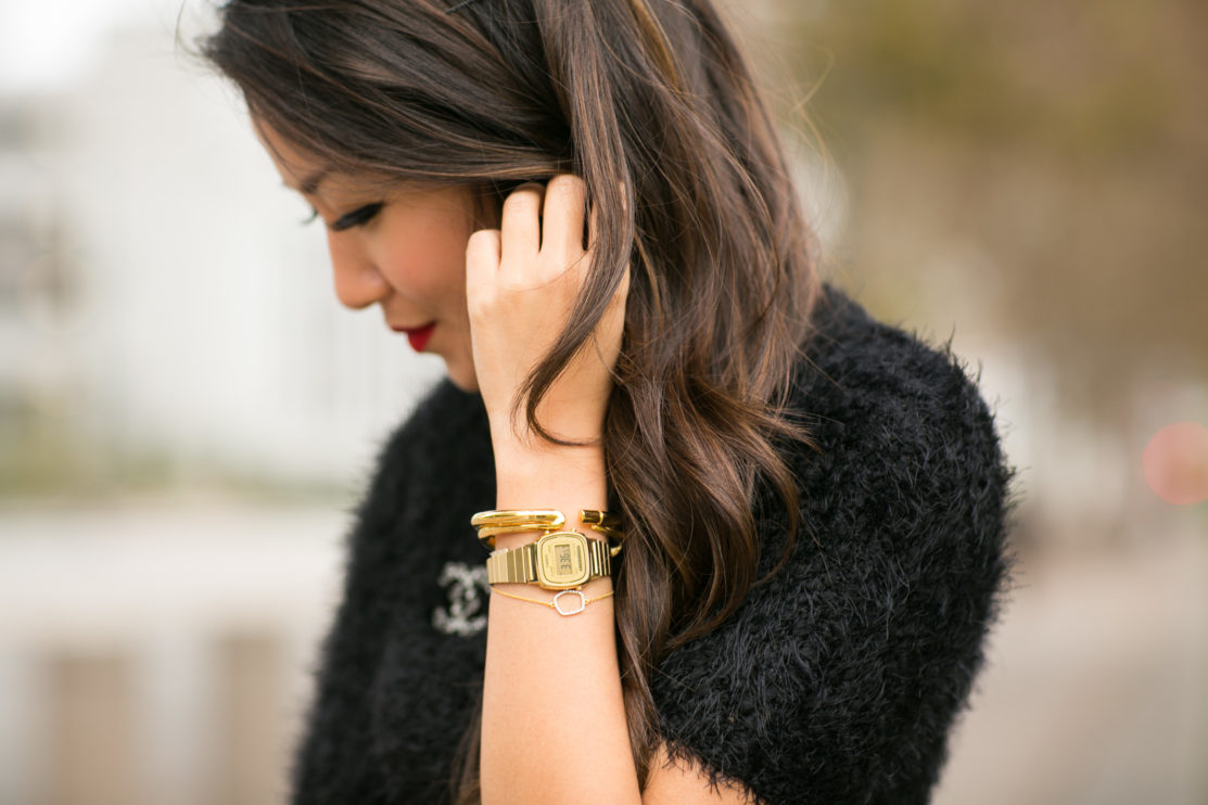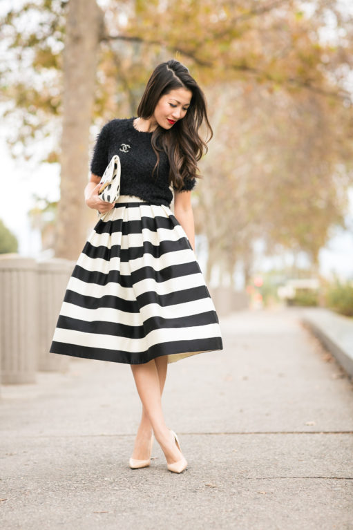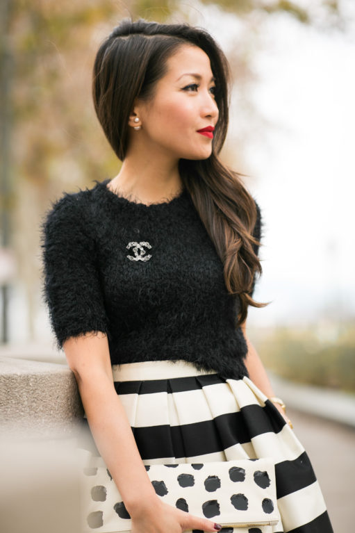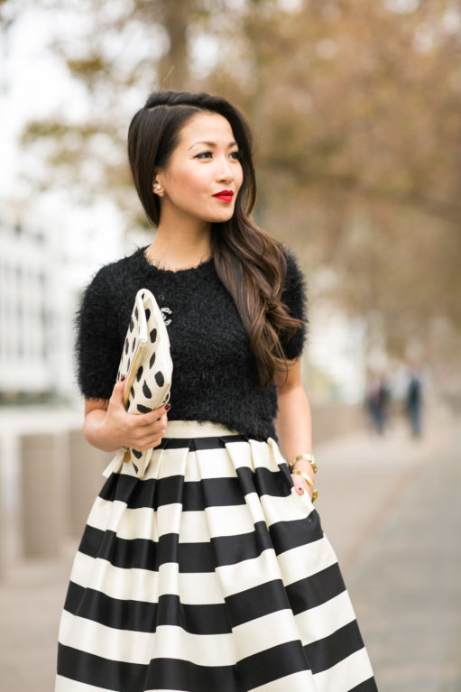 A cocktail of patterns and textures today. With so many different elements playing together, I wanted to keep the color palette rather clean and simple. Just red, black, and ivory. December is the perfect time to pull out the fuzzy sweaters (fair warning to cat lovers, your little buddies might want to pet you now!) and bold patterns. I love how this skirt and clutch share the same color scheme yet they complement each other so gracefully. A match made in pattern heaven!