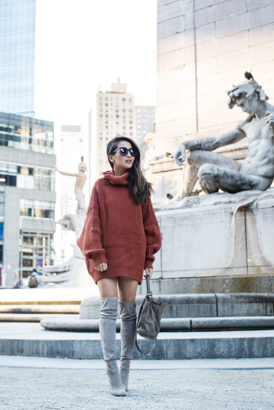 I find sweater dresses so easy to style and super comfy for fall (also adore this J.O.A. balloon sleeve sweater dress & ASOS classic turtleneck sweater dress). One of my favorite ways to wear them is with over-the-knee boots. Another way is with skinny jeans and slim combat boots.