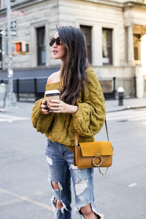 Outfit O F F – S H O U L D E R :: Express sweater (buy 1, get 1 50% off) | Zara boyfriend jeans (old, similar Topshop) | Chloe bag | Gianvito Rossi pumps | Gucci sunglasses