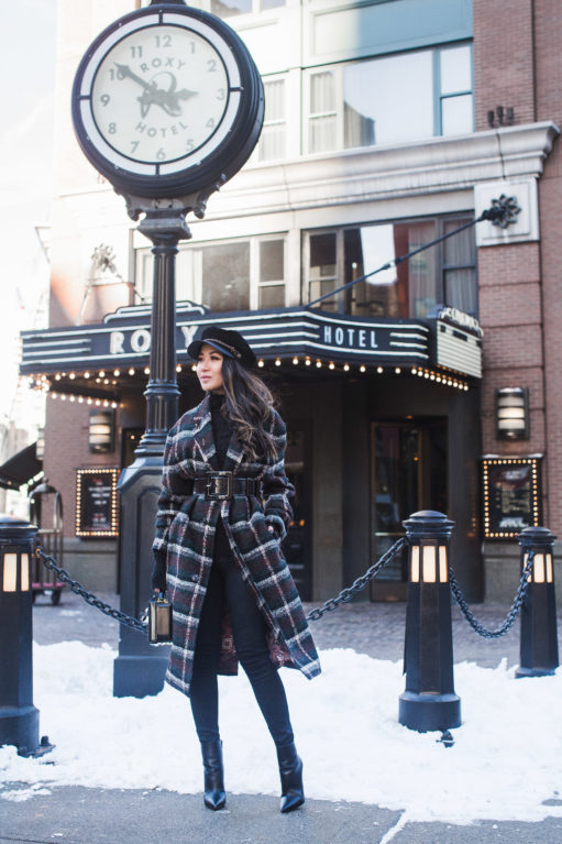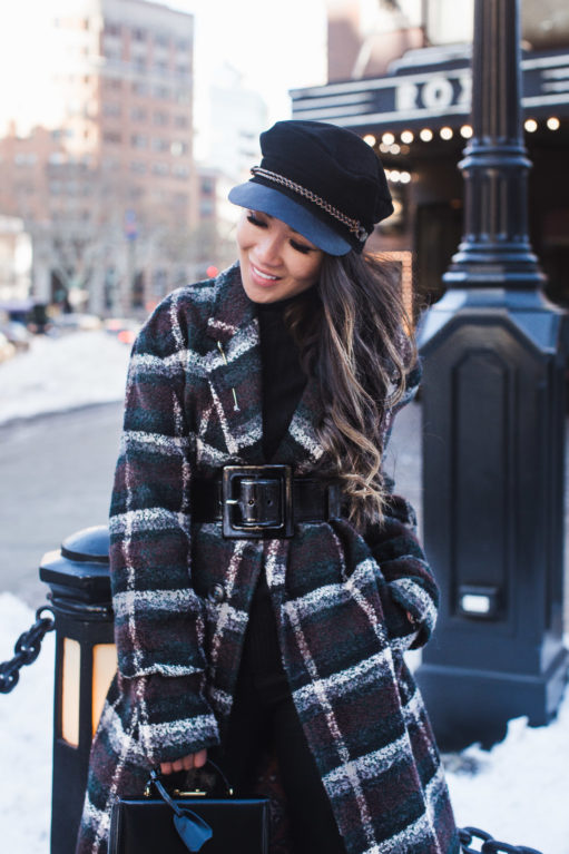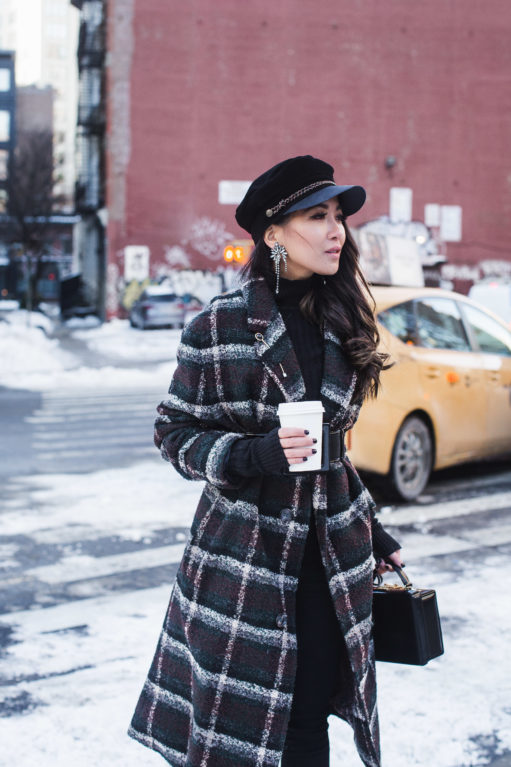 For a borrowed-from-the-boys (literally in this case) vibe but with a feminine feel, I added a wide patent belt and statement earrings to the look. And keeping the rest of the look streamlined, I wore my favorite cashmere turtleneck (under $80) and black jeans (under $70) under. I went to a girls’ dinner the other night with this outfit and felt like a character from the show Peaky Blinders! It’s the coat-hat combo!