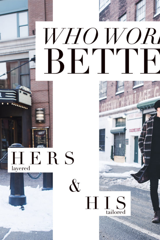 I actually love styling menswear for womenswear. While some pieces work extremely well, others are a little more difficult. In my humble opinion, relaxed coats and button-up shirts are very easy to work with. For example, this plaid coat. With its relaxed shoulders, which I think is key, it drapes beautifully on a woman’s frame. For sizing reference, Colin is 6’2 and typically wears a Medium. I’m 5’0 (5’4 on a good day!) and an XS. We’re both wearing the same coat in a mens’ Medium.
