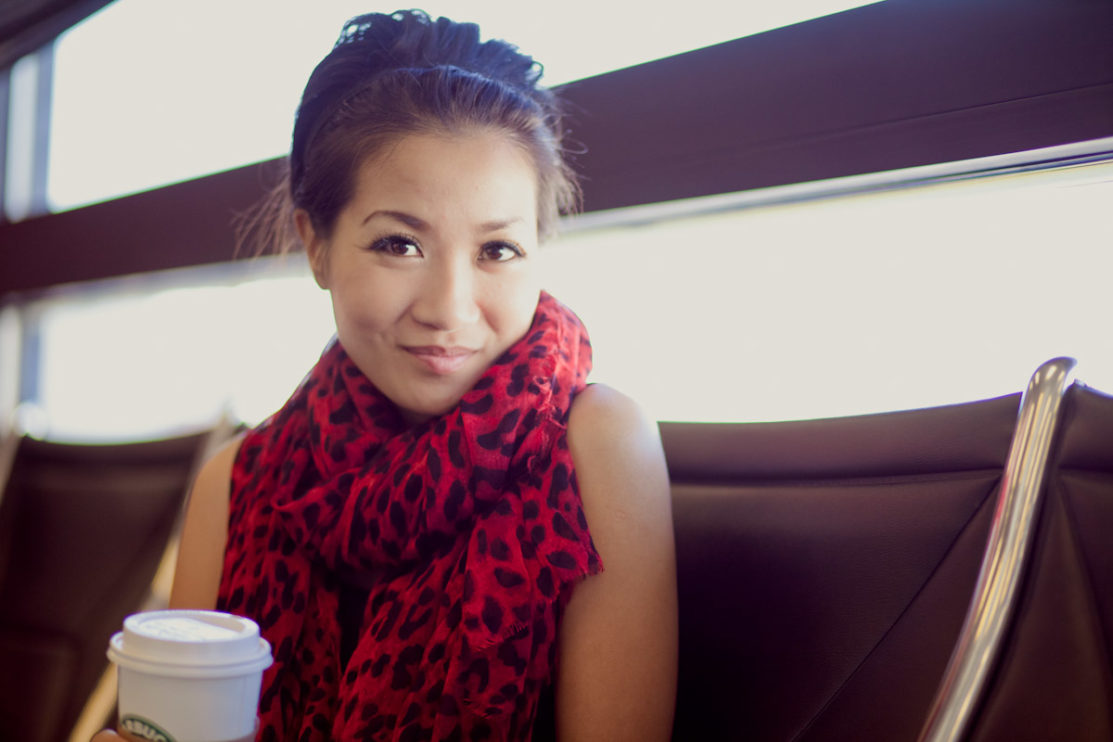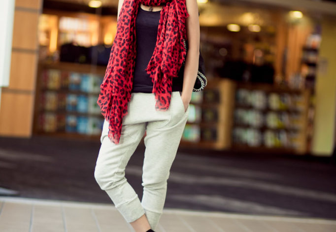 My flight uniform has always been comfy sweats, soft tops, and long scarves. No matter how hot it is outside, I tend to get cold onboard. The scarf serves dual purposes – as a wrap when it gets too cold and an accent piece to my super casual outfit. Although I really liked this red leopard print colorway, I didn’t like the way it draped because it was too thin. To add more volume, I bought two scarves and layered it together =)