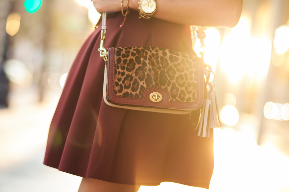 I’m celebrating the third day of autumn by injecting one of my favorite fall colors into my outfit today. The burgundy hue of the skirt was a perfect color match to the trimmings on the bag, so I knew these two items were meant to be. Furthermore, the ecru shade of the straps blended right in with the color of stripes, so naturally I couldn’t deny these three pieces from being together.