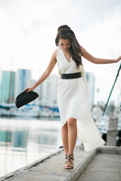 Aloha! Greetings from Hawaii everyone! I wore this dress to the opening night of Hawaii’s OUTFIT fashion event yesterday. The flowy draped silhouette was perfect for the warm humid weather.