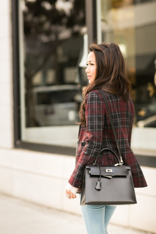 Happy Wednesday everyone! A few weeks ago, Kelly and I got together to celebrate her engagement (congrats again Kelly & Mr. Alterationsneeded!) and the launch of the Promise Bracelet. After brunch, we wandered over to Barneys, and once inside, we beelined for the Marissa Webb collection. There it stood… this blazer. A perfect autumn piece with structured lines, leather details, and a bell hem silhouette. Alternating between petting and staring, I was completely smitten with it. More importantly, I felt challenged and inspired by it. I wanted to create as many pairings as possible and to fully embrace styling a plaid print. For today’s post, the adventure begins with a day look, pairing plaid with lace and distressed jeans, and ends with a date night look, coupling plaid with holiday colors and flare shapes.