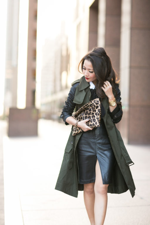 Playing with olive tones and mixing textures today. Contrast-sleeves, a peplum back, a panel leather skirt, leopard and bows… a plethora of silhouettes and patterns that are anchored by shades of olive.