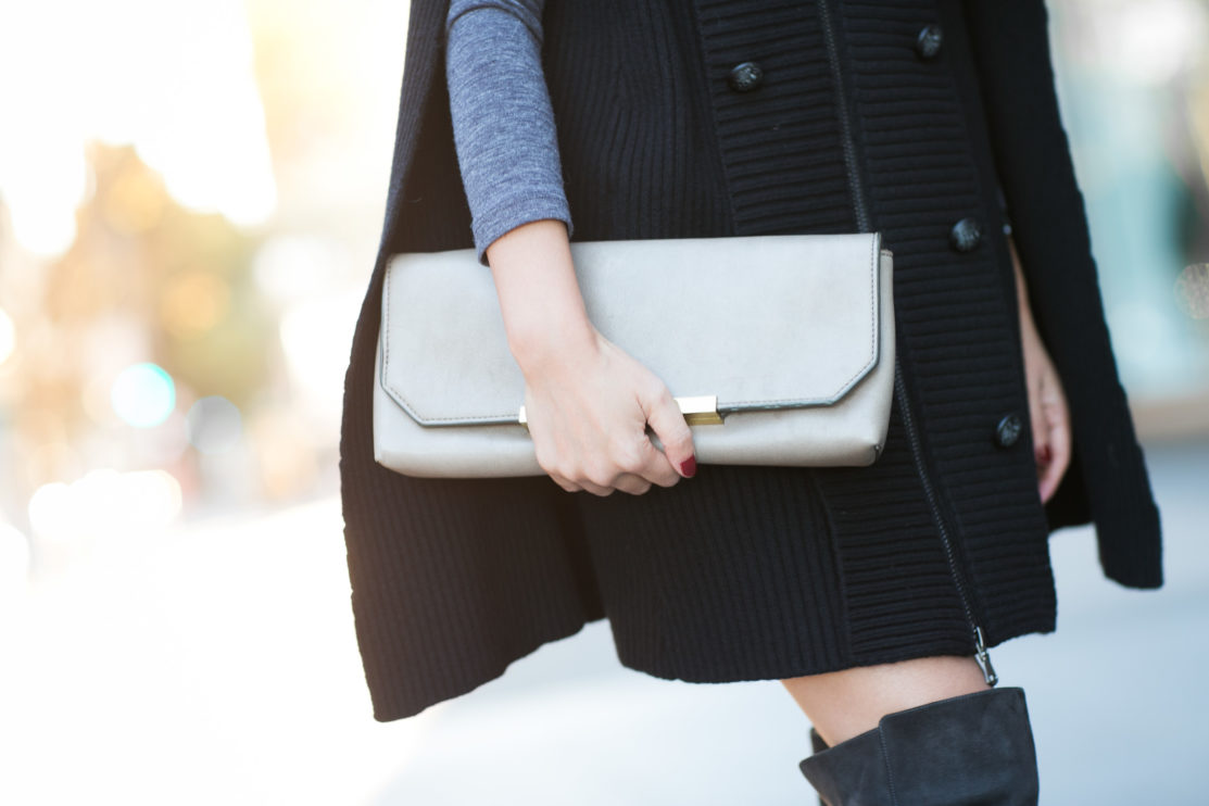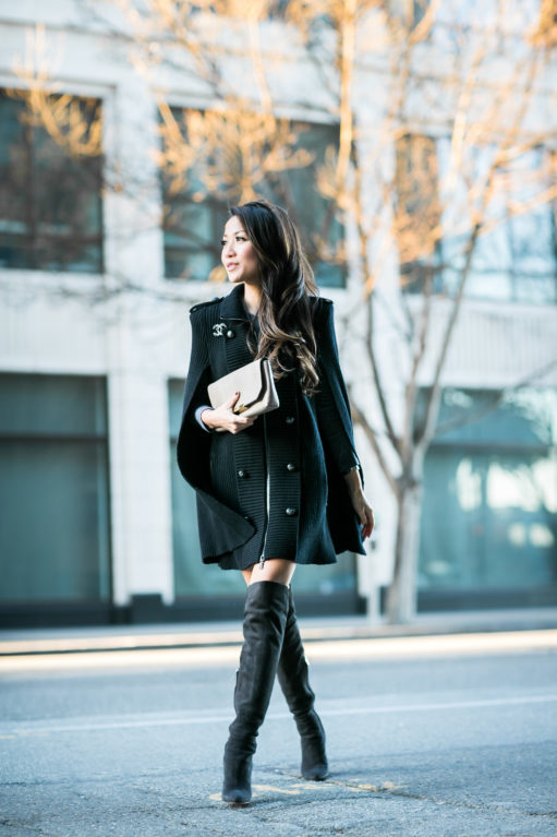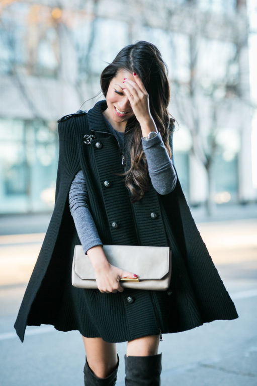 This sweater cape was perfect for the San Francisco weather. The thick cashmere wool material kept me warm and comfortable. And I love the military-inspired details… the leather epaulettes and the oversized strong shoulder shape.