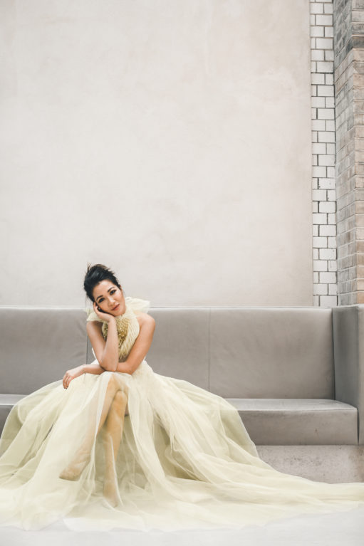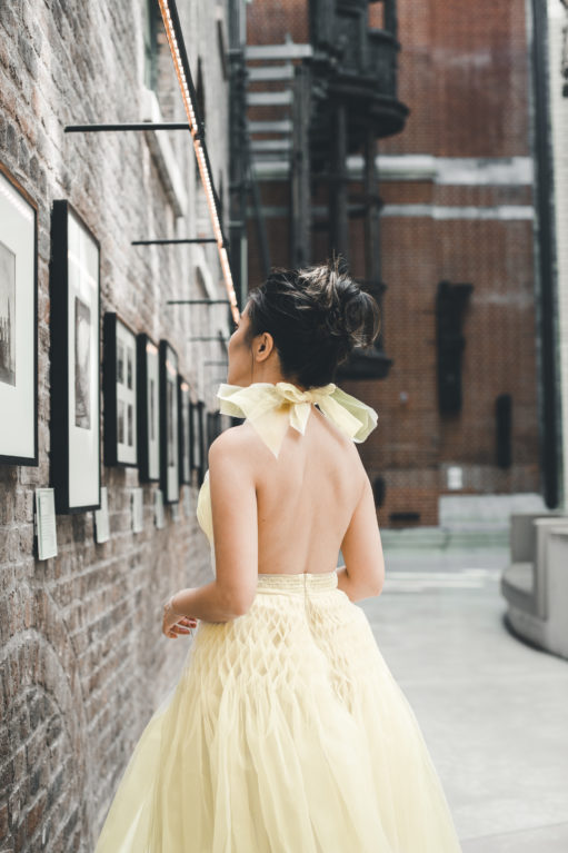 Honeycomb pleats against light honey-colored tulle, this incredible gown truly belongs in an art exhibition. I adore the high ruffle neckline, the continuous play on the honeycomb theme with bee-like jeweled embellishments, the open back, and the incredible amount of volume of this dress. Wearing it made me feel like a princess for a day (when I gave it back, I was literally caressing and petting it!).