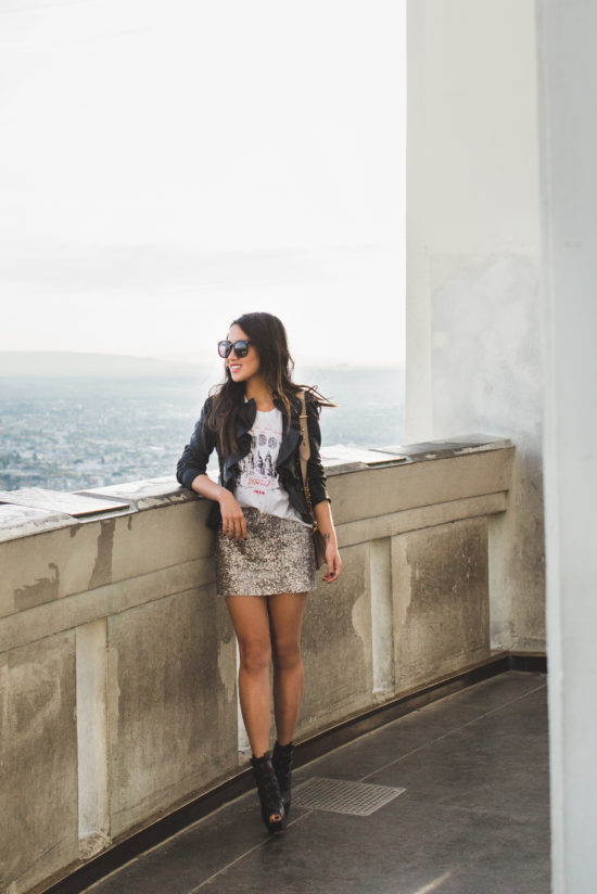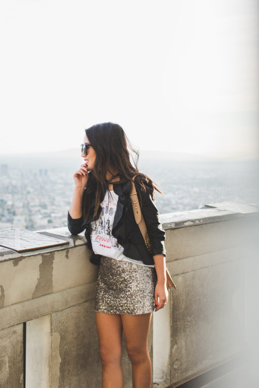 One skirt, two looks today with the perfect holiday piece… a sequin skirt! I love sequins for the holidays and this skirt goes beyond the holidays. It’s a great piece for holiday get-togethers, NYE parties, Galentine’s Day, night outs, and date nights. Basically, a little dash of edge and glamour for any day or night. For now, with New Year’s Eve coming up, this skirt is a great companion piece to create a cozy look with an oversized sweater and a casual chic vibe with a graphic tee.