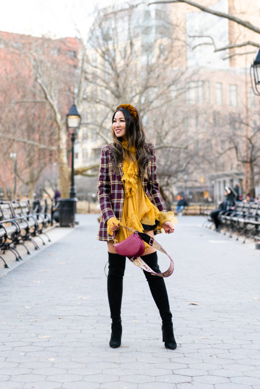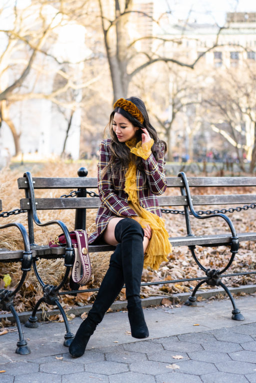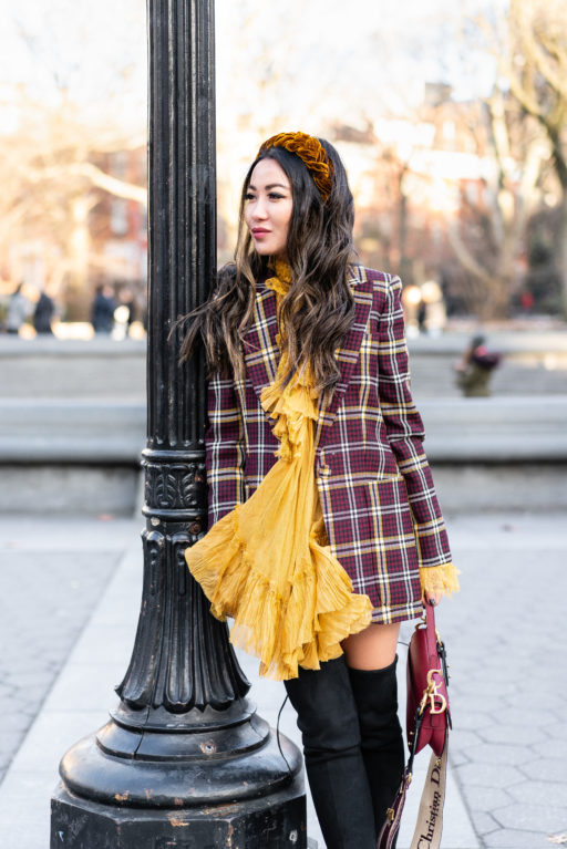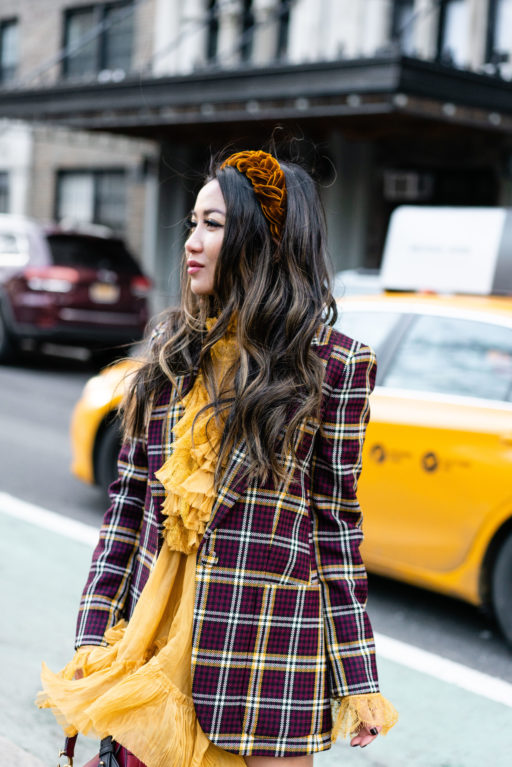 I bought this ruffle blouse with me to Marrakech and wore it as a summer piece with gladiator sandals (see related post – Where to Stay, Morocco Travel Guide). I’m styling the same piece as a winter look with boots and a plaid blazer today. The weather has been really nice in NYC recently, so three layers (thermal + yellow ruffle blouse + wool blazer) is good enough. I really love the splashes of burgundy with gold. It’s such a warm yet striking autumn/winter color combination. And the look is not complete without a touch of holiday. Tada, a velvet braided headband!