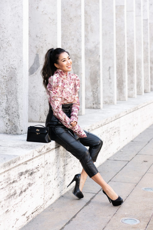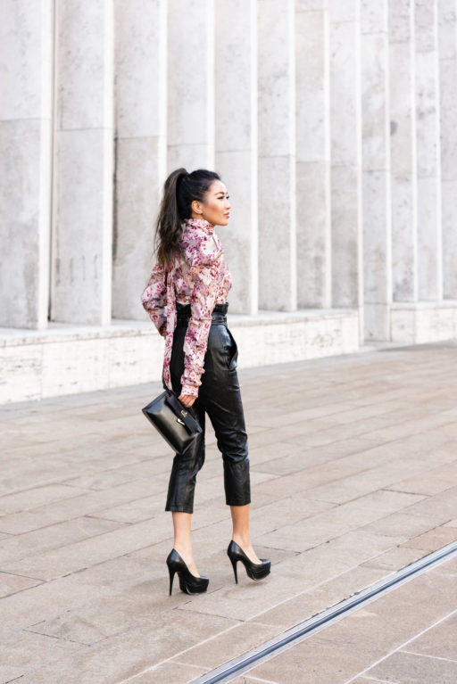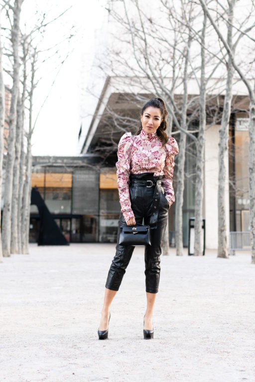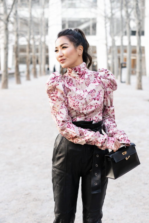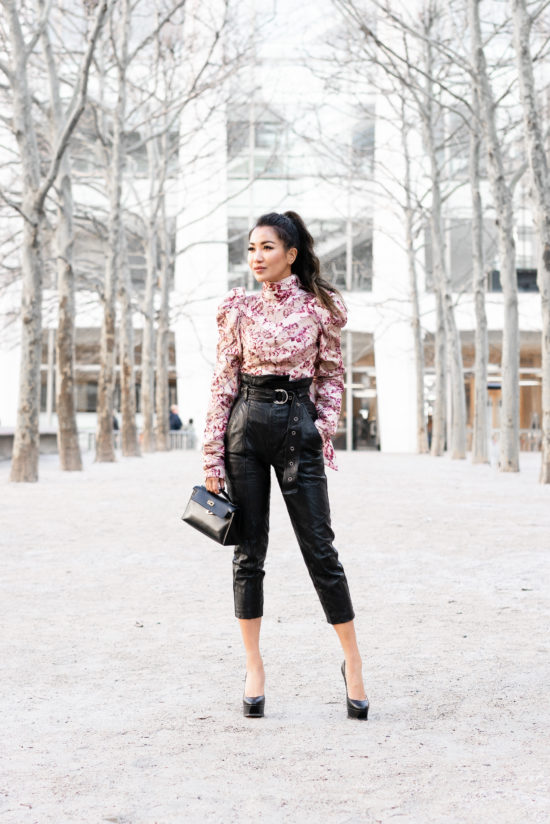 We can’t go full floral yet (it’s unfortunately still very cold here in NYC), but we can go half floral. With winter still nipping at our faces (figuratively and literally), I went with cold weather favorites to pair with the soft florals. These high-waisted leather pants are my favorites and together with a draped wool coat, they create a tough yet delicate contrast against the florals and Victorian details. It feels feminine yet powerful, a tease of spring but still comfy and warm enough for winter.