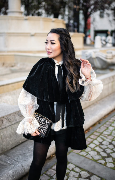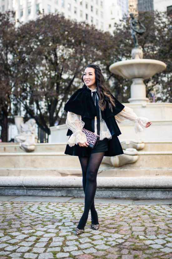 Straight out of a movie, this outfit has more characters than any films! A velvet cape + lace tulle top + leo pumps = holiday style.