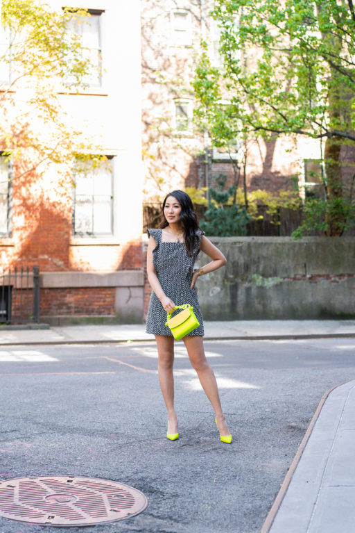 One of my favorite ways to wear neon accessories is to pair them with neutral pieces. This Scoop ruffle dress is simple yet darling. I really love how the sharpness of the square neckline is juxtaposed with the softness of the ruffles. And the black and white print motif creates a beautiful canvas to highlight the pops of neon.