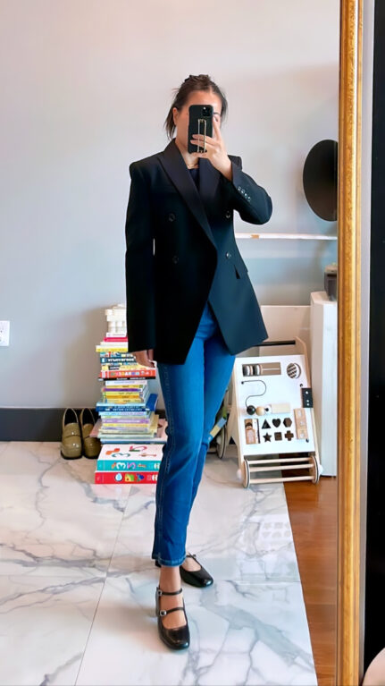 On another note – just wanted to share this double breasted suit blazer again, casually styled with jeans. It’s beautiful in person! Structured, tailored and looks so sleek and polished. For sizing reference, I’m 5 ft 105 pounds and wearing a size XS (no alterations needed on the blazer).
